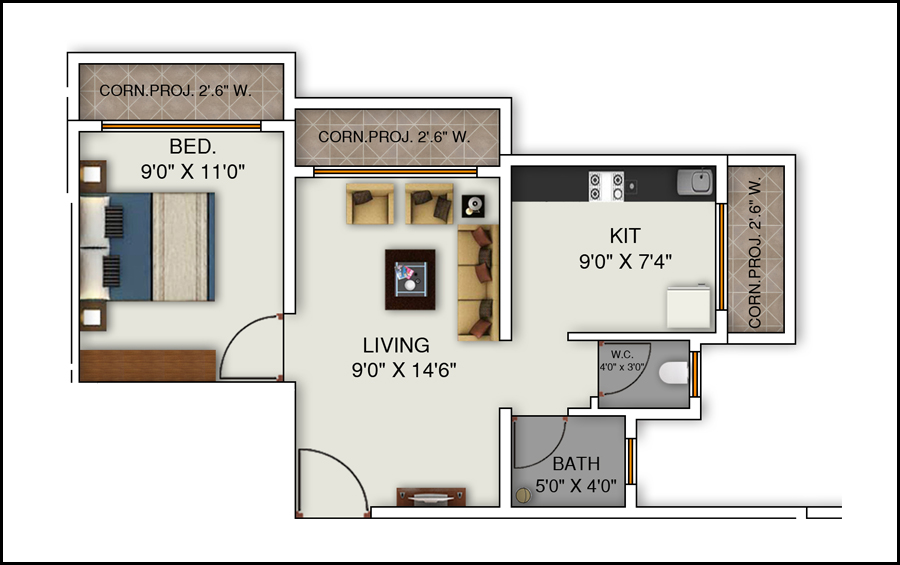 Grill on Balconies & Windows | Kitchen Trolley | WIFI Concealed Fittings | Fan & CFL Provision | CCTV Security | Anodised Sliding Windows | 500 Ltr. Sintex Water Tank | False Ceiling in Living Room